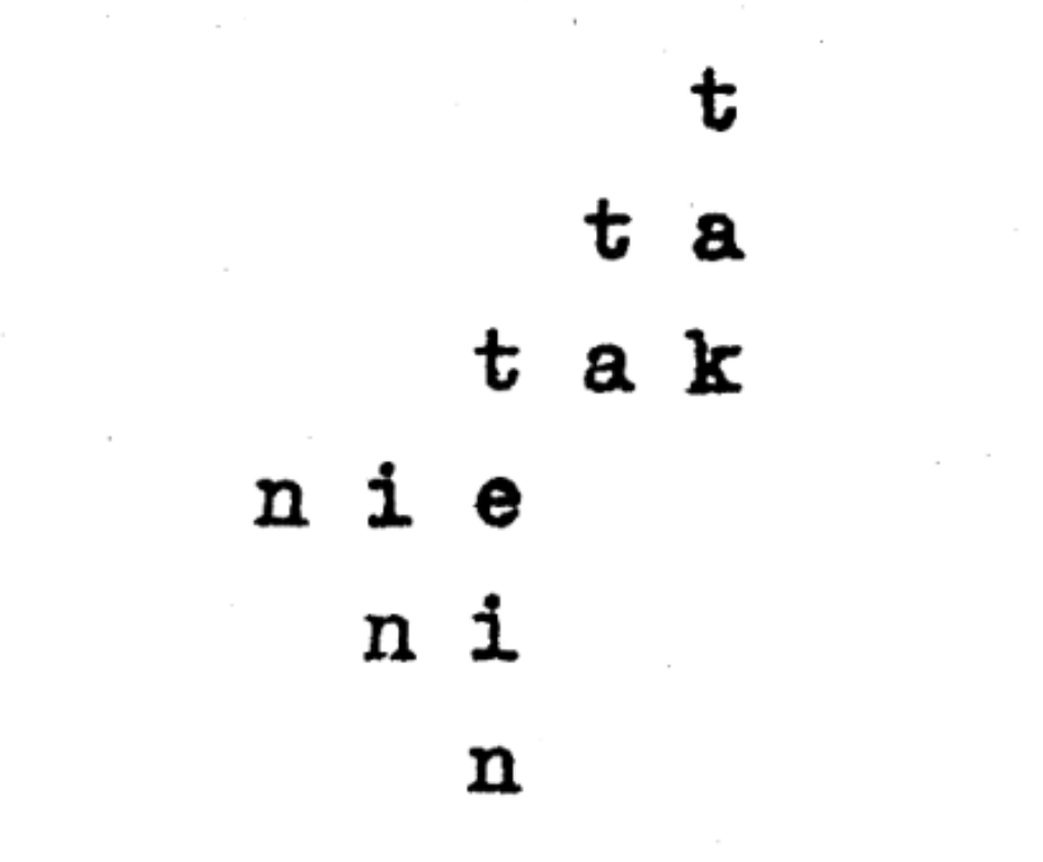 Praca zbudowana jest z ułożonych w dwa trójkąty słów „tak” i „nie”. Z prawej strony w trzech wersach narastająco przybywa po jednej literze słowa „tak”; z lewej i poniżej – w trzech wersach ubywa po jednej literze słowa „nie”. Kompozycja sprawia, że w jednej ukośnej linii łączą się ze sobą litery „t” oraz „i”, wizualnie do siebie bardzo podobne, natomiast w drugiej – również podobne litery „a” i „e”. Koncepcja ta sugeruje, że dwa te przeciwstawne pojęcia w swoim zapisie różnią się od siebie minimalnie, co po raz kolejny w twórczości Dróżdża skupia uwagę na paradoksalnych możliwościach wyrażania pojęć przez pismo. Praca prezentowana jako maszynopis (z trójkątami z liter odwrotnie ułożonymi w pozycjach prawo – lewo) oraz plansza z literami napisanymi ręcznie tuszem na brystolu.