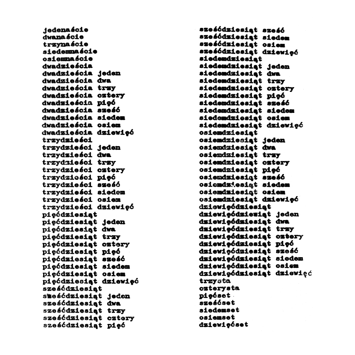 Praca dotyczy relacji między liczbami a ich nazwami w języku polskim. Stanisław Dróżdż zwraca uwagę na rytm zmian, jakie zachodzą w członach słownych dodawanych do nazw cyfr będących elementami nazw liczb większych od 10. To kolejna praca metajęzykowa. Prezentowana była w formie wydruku komputerowego.