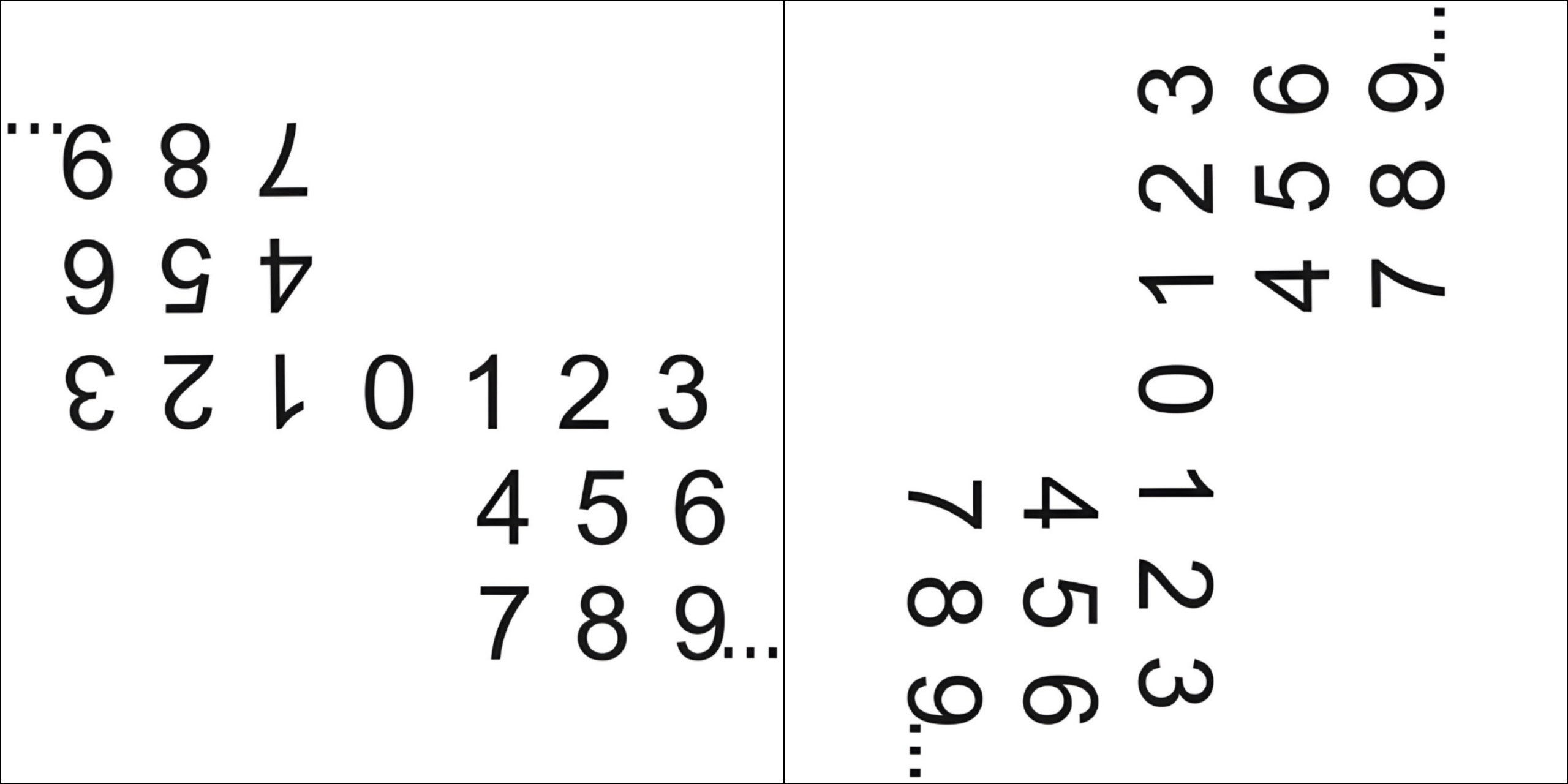 Praca składa się z dwóch kwadratowych plansz, zawierających ułożone trójkami i dwukrotnie zapisane na każdej planszy cyfry od 1 do 9 oraz 0, które znajduje się w centrum, łącząc zestawy cyfr, z których każdy kończy się wielokropkiem – sugerując dalszy ciąg zapisu. Zestawy cyfr ustawione są wobec siebie po przekątnej oraz obrócone wzajemnie o 180 stopni; na pierwszej planszy zajmują drugą i czwartą jej ćwiartkę i zapisane są w poziomie, na drugiej – pierwszą i trzecią, z zapisem w pionie. Ten kształt wizualny przywodzi na myśl zarówno układ kartezjański, tak istotny dla twórczości Drożdża, jak i tarczę zegara ze wskazówkami obracającymi się wokół osi, którą stanowi tu zero. Można wywnioskować, że jest to inaczej podjęty temat z Zamiany energii powstałej w roku 2000 – czyli temat relacji między czasem cyklicznym a czasem linearnym. Tym razem to nie linia rozwija się skutkiem cyklicznych obrotów, ale ciągnąca się w nieskończoność linia czasu podlega obrotowi. Praca realizowana była w postaci druku cyfrowego na papierze naklejonym na sztywne podłoże.