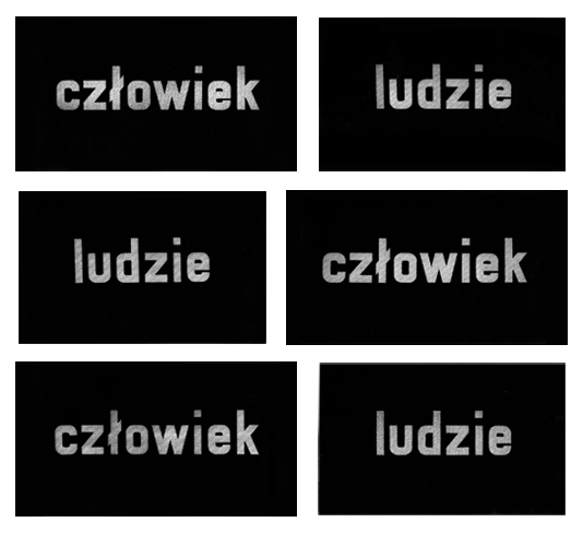 Praca oparta jest na wzajemnych relacjach między pojęciami „człowiek” i „ludzie”. Składa się z sześciu czarnych poziomych prostokątów zestawionych w dwóch kolumnach i trzech rzędach. Na każdym z nich umieszczone jest centralnie jedno słowo zapisane białymi literami – w układzie z góry na dół i od lewej do prawej (zgodnie z kierunkiem czytania tekstu): „człowiek”, „ludzie” / „ludzie”, „człowiek” / „człowiek”, „ludzie”. W każdą literę pierwszego słowa „człowiek” wpisane jest wielokrotnie powtórzone to samo; w pierwsze słowo „ludzie” – wielokrotnie powtórzone to samo słowo. W drugie słowo „ludzie” wpisane jest wielokrotnie powtórzone słowo „człowiek”; w drugie słowo „człowiek” wpisane jest wielokrotnie powtórzone słowo „ludzie”. W trzecie słowo „człowiek” wpisane są oba te wielokrotnie powtórzone słowa nałożone na siebie; podobnie w trzecim słowie „ludzie”. Praca jest refleksją nad wzajemną relacją między pojęciami wyrażonymi przez słowa „człowiek” i „ludzie” – między indywidualną ludzką osobą a tymi jednostkami ujętymi zbiorowo. Prezentowana była w postaci ręcznie malowanej i pisanej planszy położonej na podłodze.