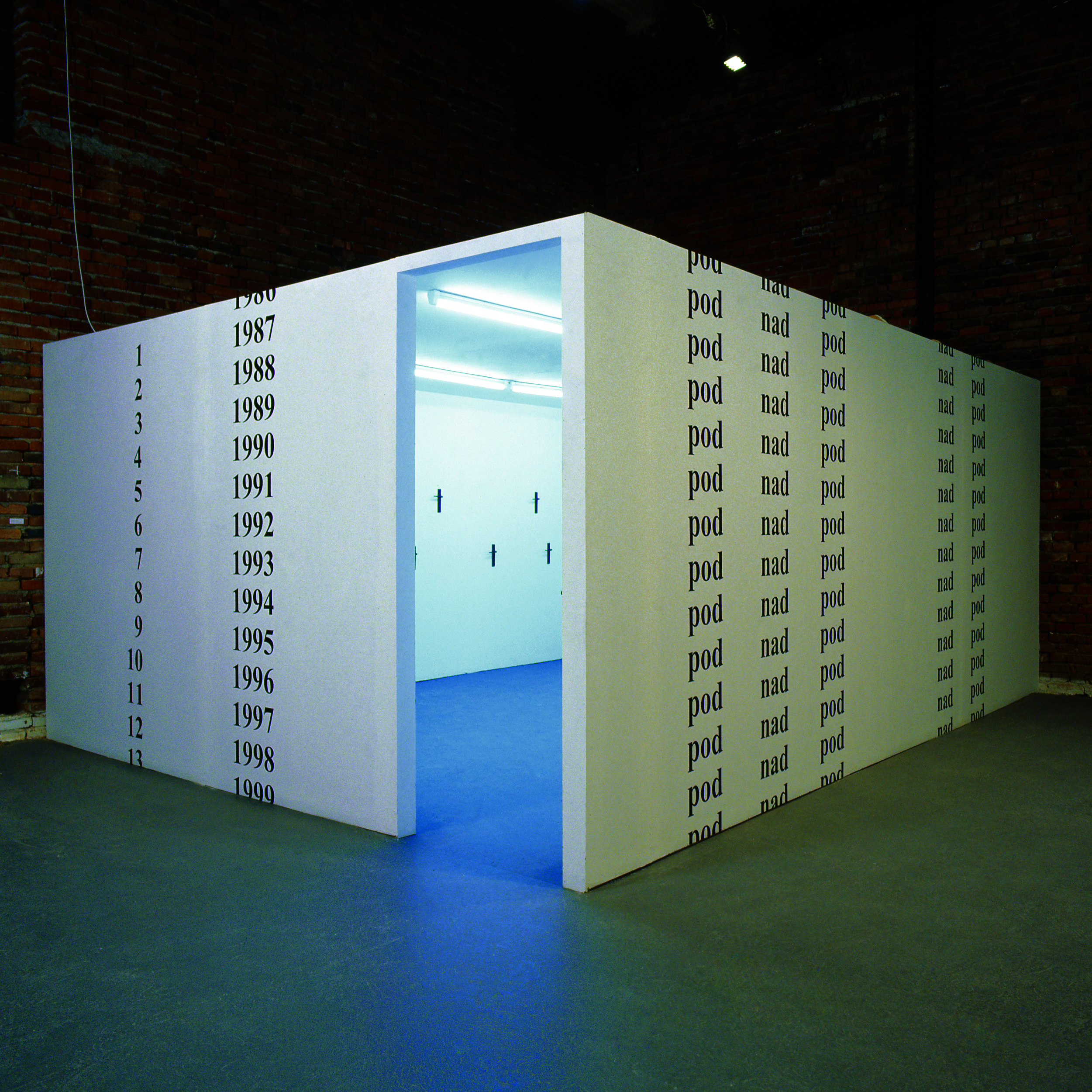 Praca przestrzenna, w której kluczowym elementem są czarne metalowe klamki do drzwi. Zamontowane zostały w „white cube”, analogicznie do między, na różnych wysokościach na jego ścianach, odpowiednio do wyobrażonych drzwi, które musiałyby się na siebie wzajemnie nakładać i przekraczać granice ścian. Stanisław Dróżdż twierdził, że nadal jest to poezja konkretna, ponieważ klamki pełnią tu funkcję znaku, który tym razem ma charakter realnego obiektu (obecność klamki oznacza obecność drzwi na zasadzie „pars pro toto”). Praca została po raz pierwszy zrealizowana w CSW Zamek Ujazdowski (1999), następnie na wystawie monograficznej Stanisława Dróżdża w Muzeum Narodowym we Wrocławiu, 2009. W pierwszej realizacji na zewnętrznych ścianach kubika zbudowanego we wnętrzu galerii umieszczone były w pionowych kolumnach liczby od jeden do trzynaście, daty roczne od 1986 do 1999 oraz naprzemienne kolumny wypełnione powtarzającymi się przyimkami „pod” i „nad”.