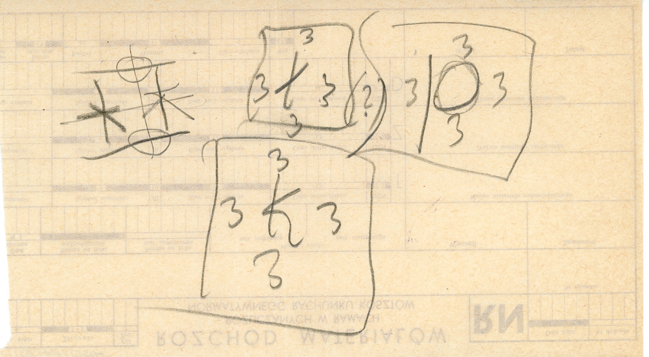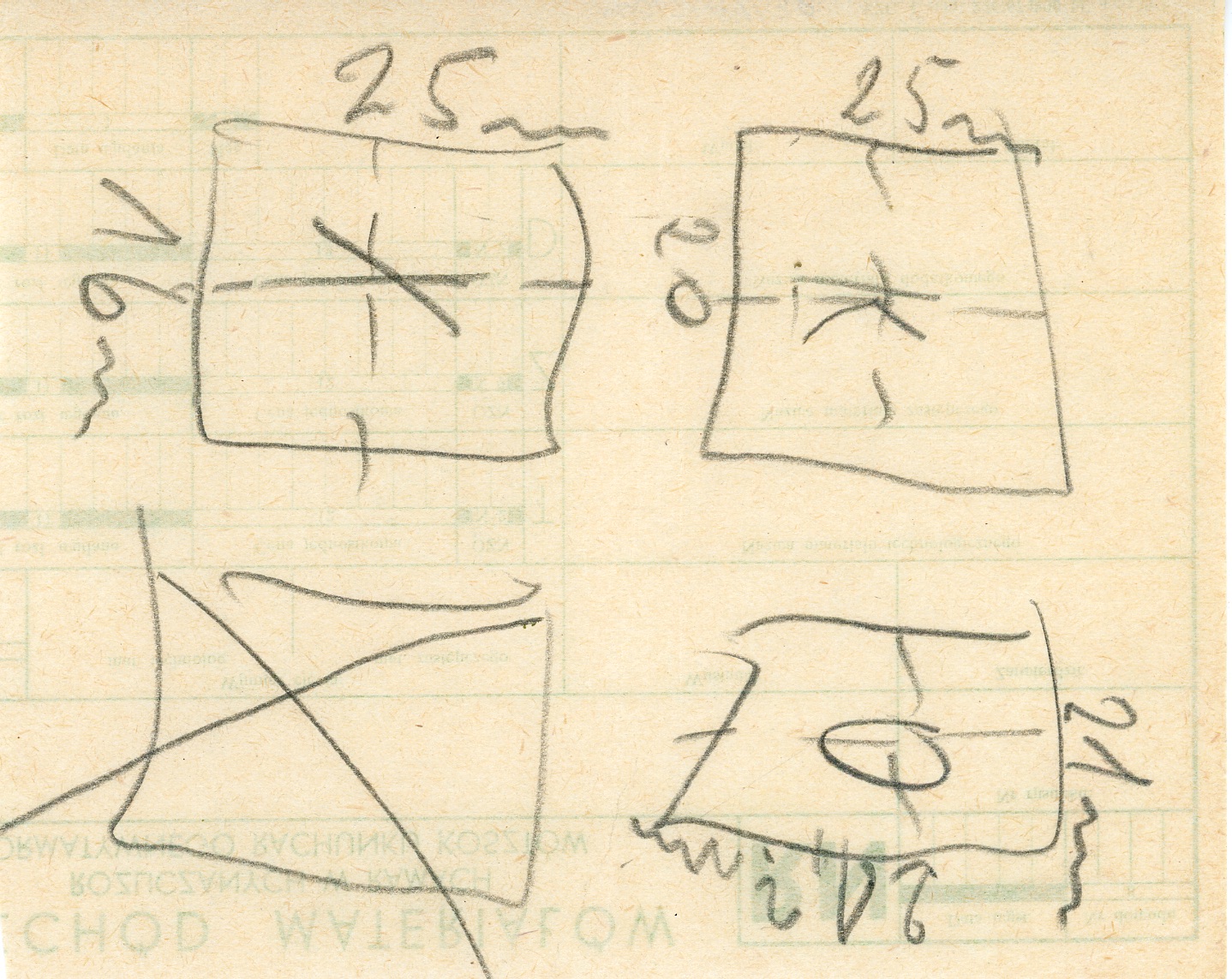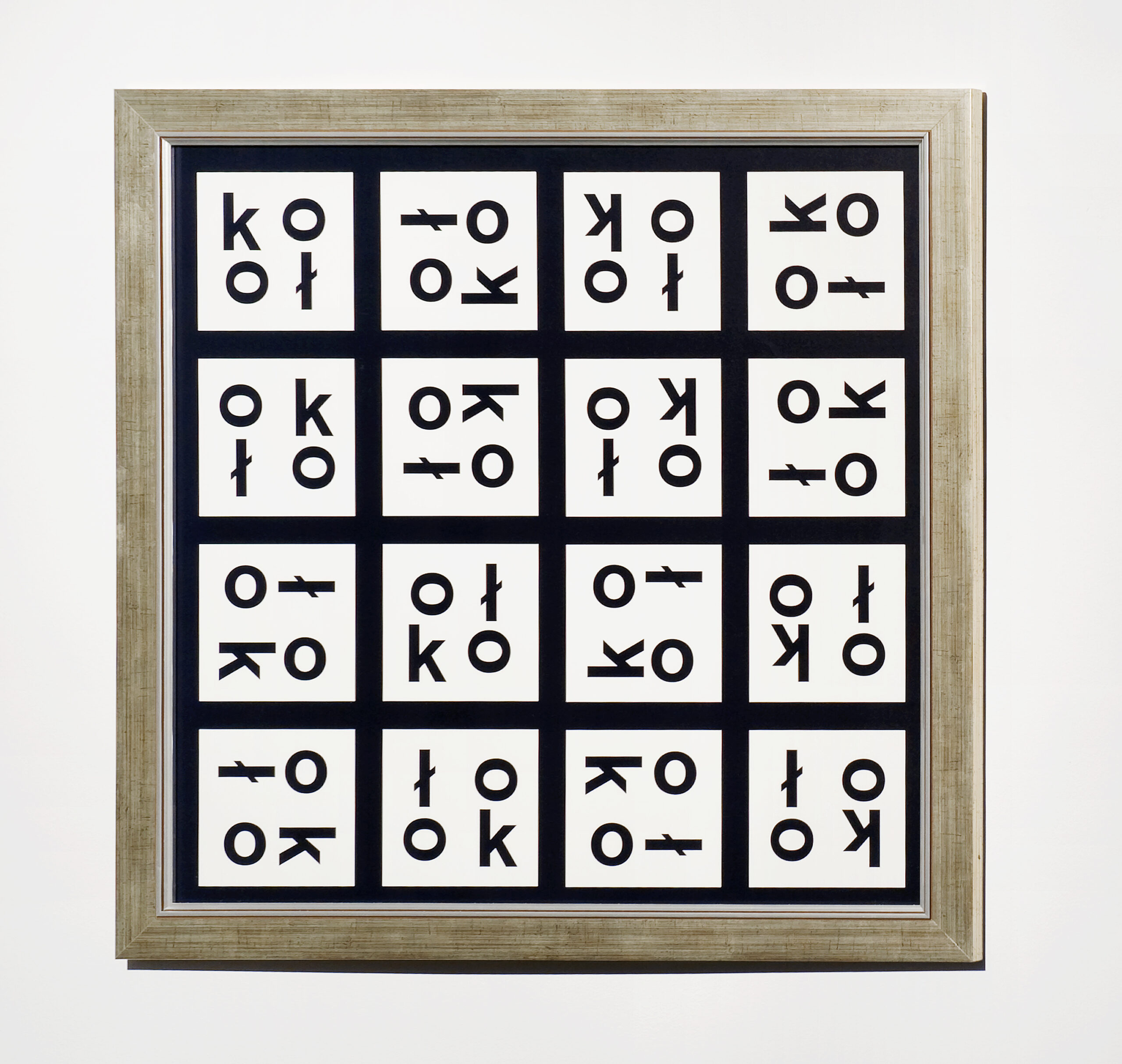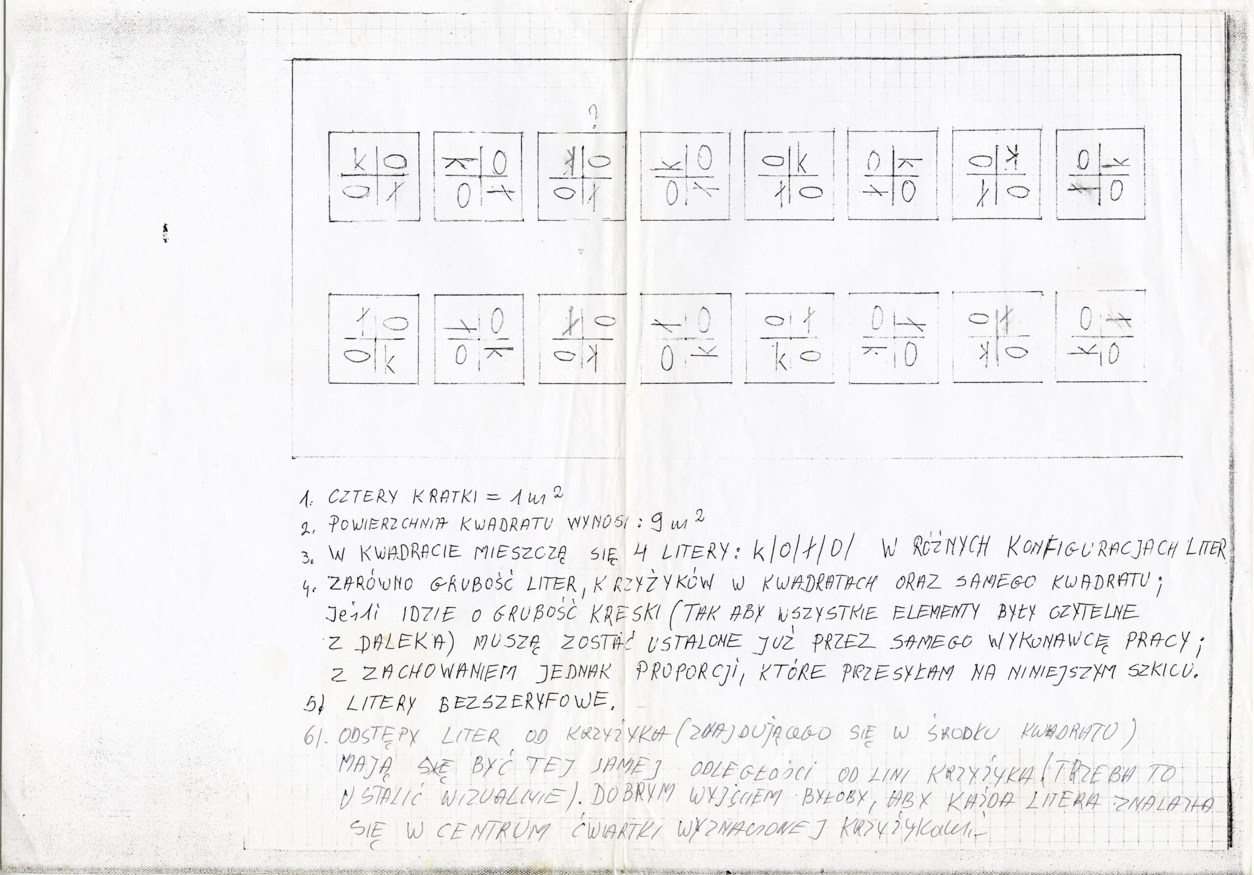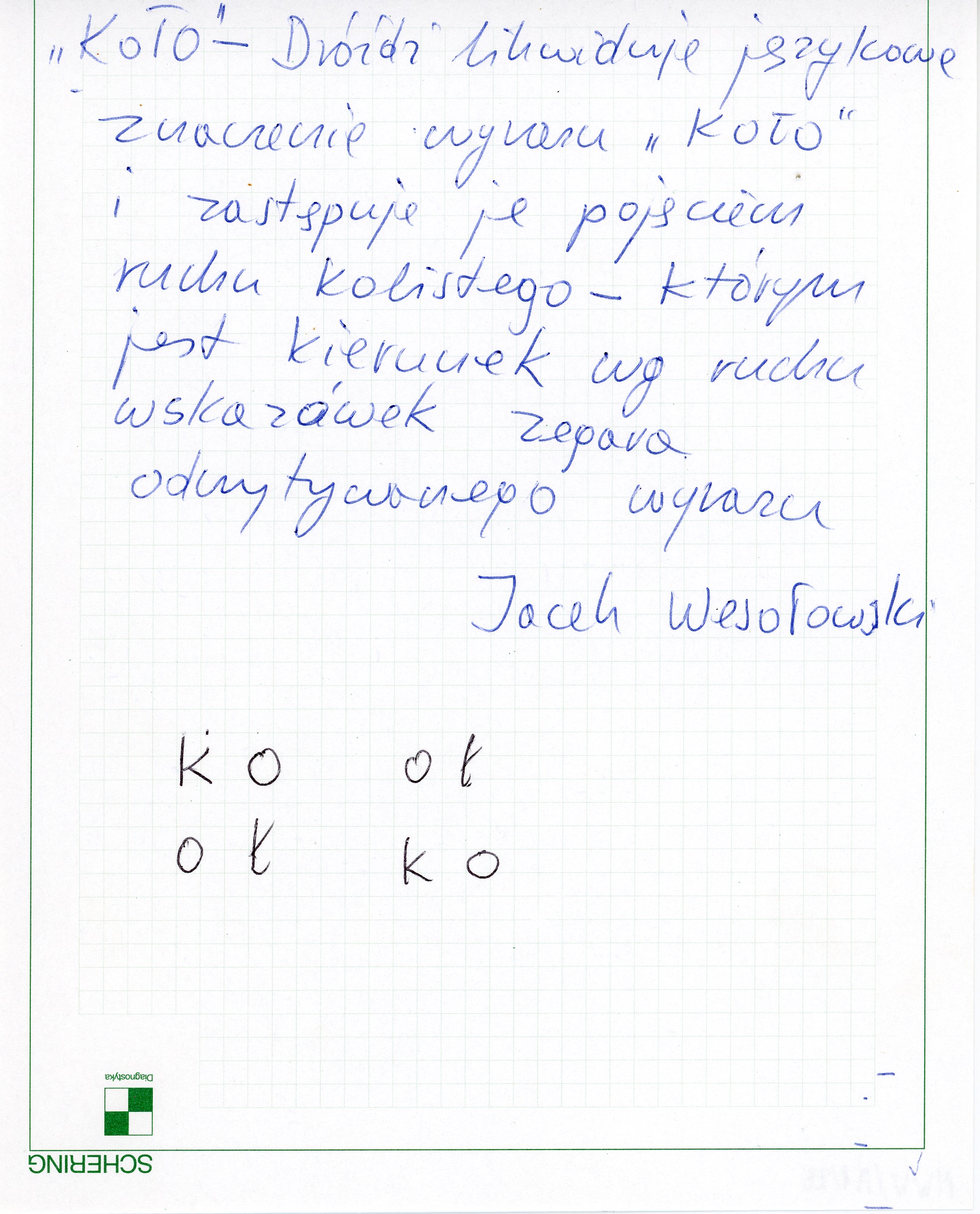 Praca składa się z szesnastu kwadratów; w każdym z nich wpisane jest słowo „koło”, którego litery obracają się wokół własnej osi zgodnie z kierunkiem wskazówek zegara oraz w przeciwnym kierunku. Koncepcja oparta jest na tautologii. Pierwotna wersja pracy to litery umieszczone na planszy w układzie pionowym, w którym kolejna litera umieszczona jest w pozycji zgodnej z ruchem przeciwnym do ruchu wskazówek zegara. Koło prezentowane było w postaci osobnych plansz umieszczonych na podłodze w układzie 4 x 4, w takich odstępach, by możliwe było poruszanie się wokół każdego kwadratu zgodnie z obrotem liter w nim zawartych. Realizowana była także jako prezentacja koncepcji – w postaci kwadratów wyciętych i naklejonych na kwadratowe podłoże, odbitki fotograficznej oraz druku cyfrowego na folii. W przestrzeni publicznej Wrocławia zrealizowana została w kamieniu stała wersja koła (pl. Nowy Targ, 2016).
