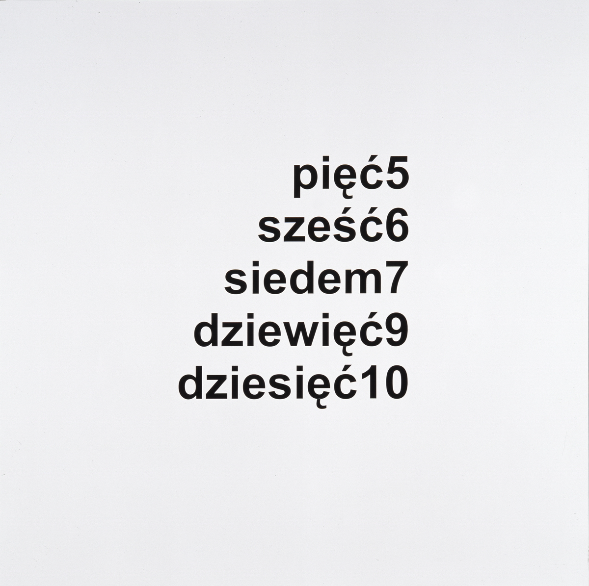 Praca podejmuje ponownie (jak w utworze Artykulacje) temat relacji numerycznego zapisu liczb wobec ich zapisu słownego. Wśród liczb od jeden do dziesięć autor wybrał kolejno te z nich, których nazwa i zapis słowny wydłuża się stopniowo wraz ze wzrostem wartości liczby. Prezentowana była jako plansza z naklejonymi na sztywne podłoże literami z czarnej folii oraz jako odbitka fotograficzna.