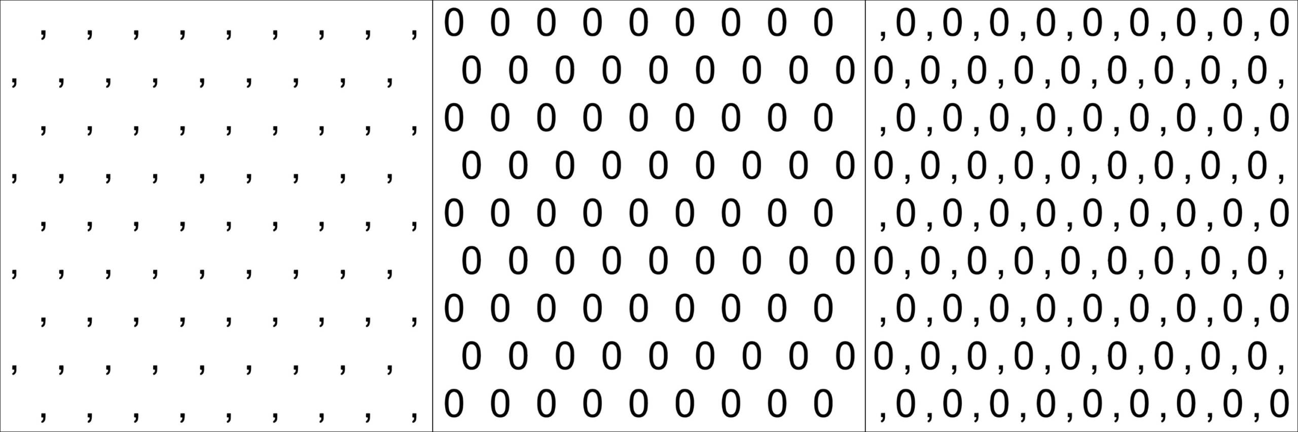 Praca składa się z trzech kwadratowych plansz, zawierających kolejno: same przecinki, same zera, zera oddzielane wzajemnie od siebie przecinkami. Kontynuuje ideę podjętą w Continuum z 1973 roku. W tamtym utworze jeden przecinek wstawiony między zera nadawał znaczenie czysto wizualnemu wzorowi; tutaj umieszczenie przecinka po każdym zerze żadnego znaczenia nie tworzy. Koncepcja tej pracy wywołuje refleksję nad wagą konwencji, która, wprowadzając stałe reguły, tworzy system językowy – werbalny lub matematyczny. W swoich pojęciokształtach Stanisław Drożdż, wyjmując elementy języka z systemu i wprowadzając je w nowy kontekst, paradoksalnie wskazuje na sens i wartość istnienia językowego systemu. Praca realizowana była w postaci druku cyfrowego na papierze naklejonym na sztywne podłoże.