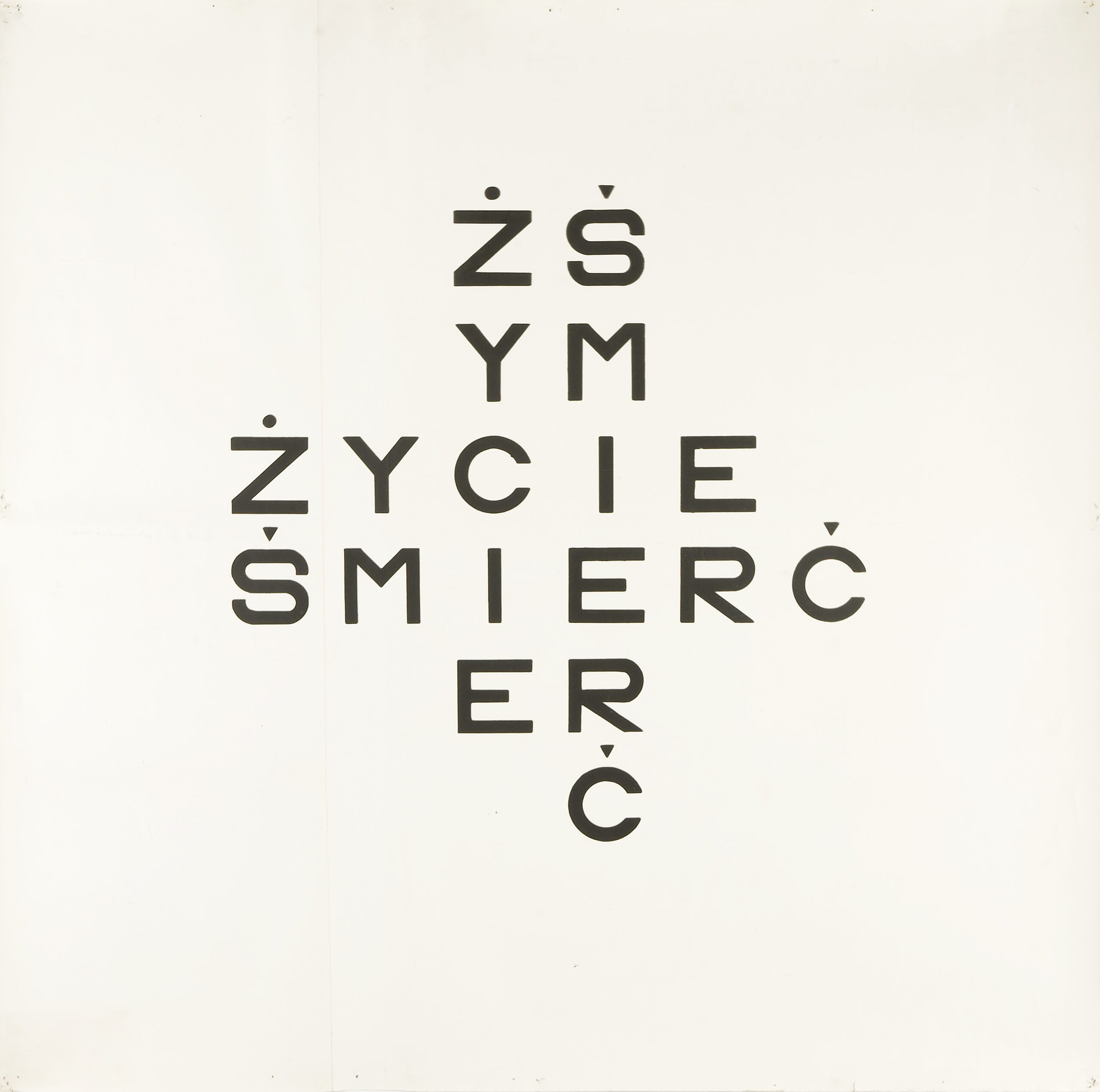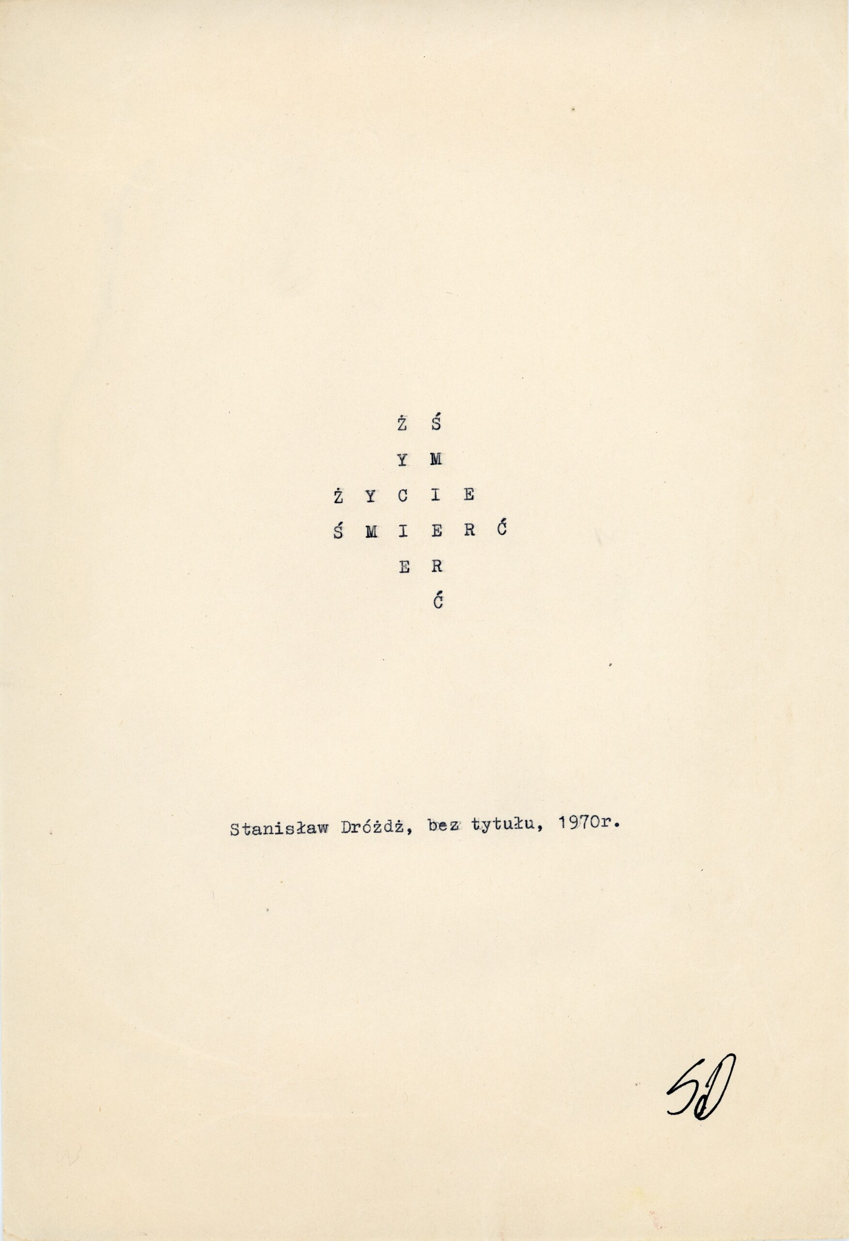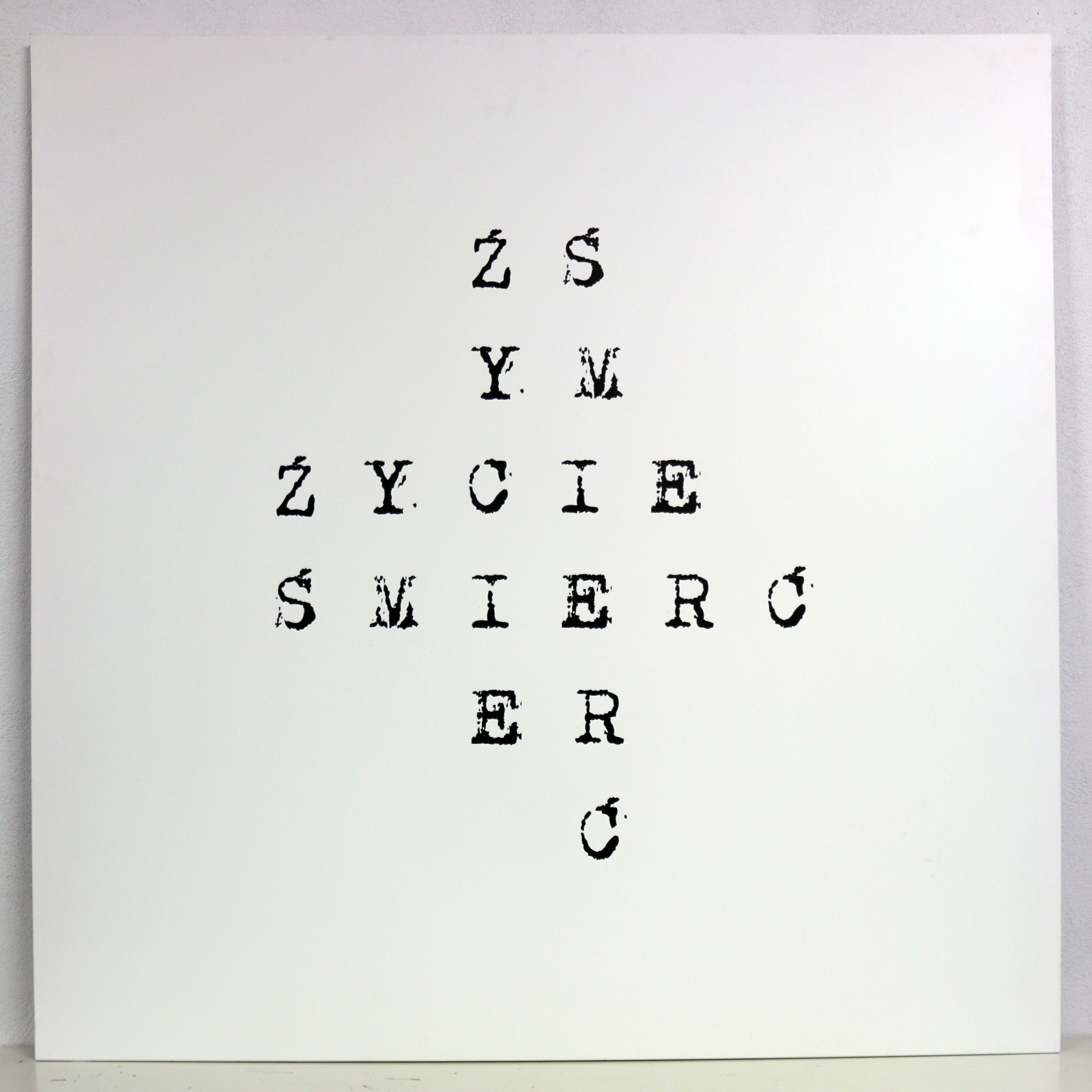 Koncepcja pracy oparta jest na spostrzeżeniu, że słowa „życie” i śmierć” które zawierają tylko dwie wspólne litery: „i” oraz „e”, po dwukrotnym zapisaniu ich w pionie i poziomie oraz nałożeniu tych zapisów na siebie krzyżują się, sugerując zarówno formę krzyżówki, jak i chrześcijańskiego krzyża. Stwarza to możliwość wieloznacznej interpretacji obu tych pojęć we wzajemnej relacji. Życie i śmierć mogą przebiegać równolegle (ktoś się rodzi, ktoś umiera), jak i przecinać się (śmierć ucina życie, ale raz w historii w osobie Jezusa Chrystusa życie przecięło śmierć). Praca prezentowana była w formie czarnych liter na białym tle oraz białych liter na czarnym tle. Realizowana jako maszynopis na papierze, pismo atramentem na papierze, litery wycięte z folii na papierze, odbitka fotograficzna oraz druk cyfrowy na papierze naklejonym na sztywne podłoże. Znajduje się także na nagrobku Stanisława Dróżdża w Sławkowie, w postaci liter wykutych w kamieniu.