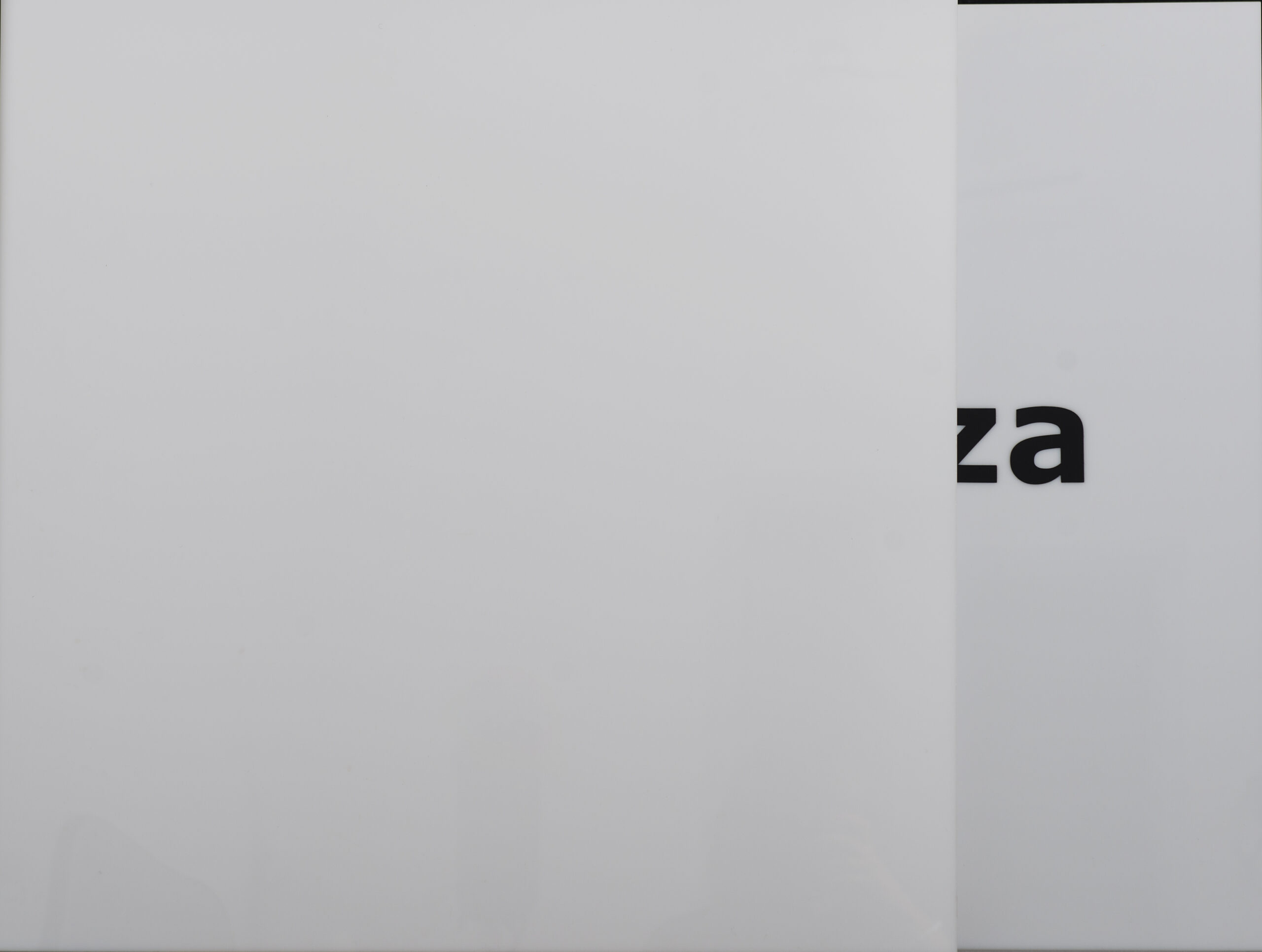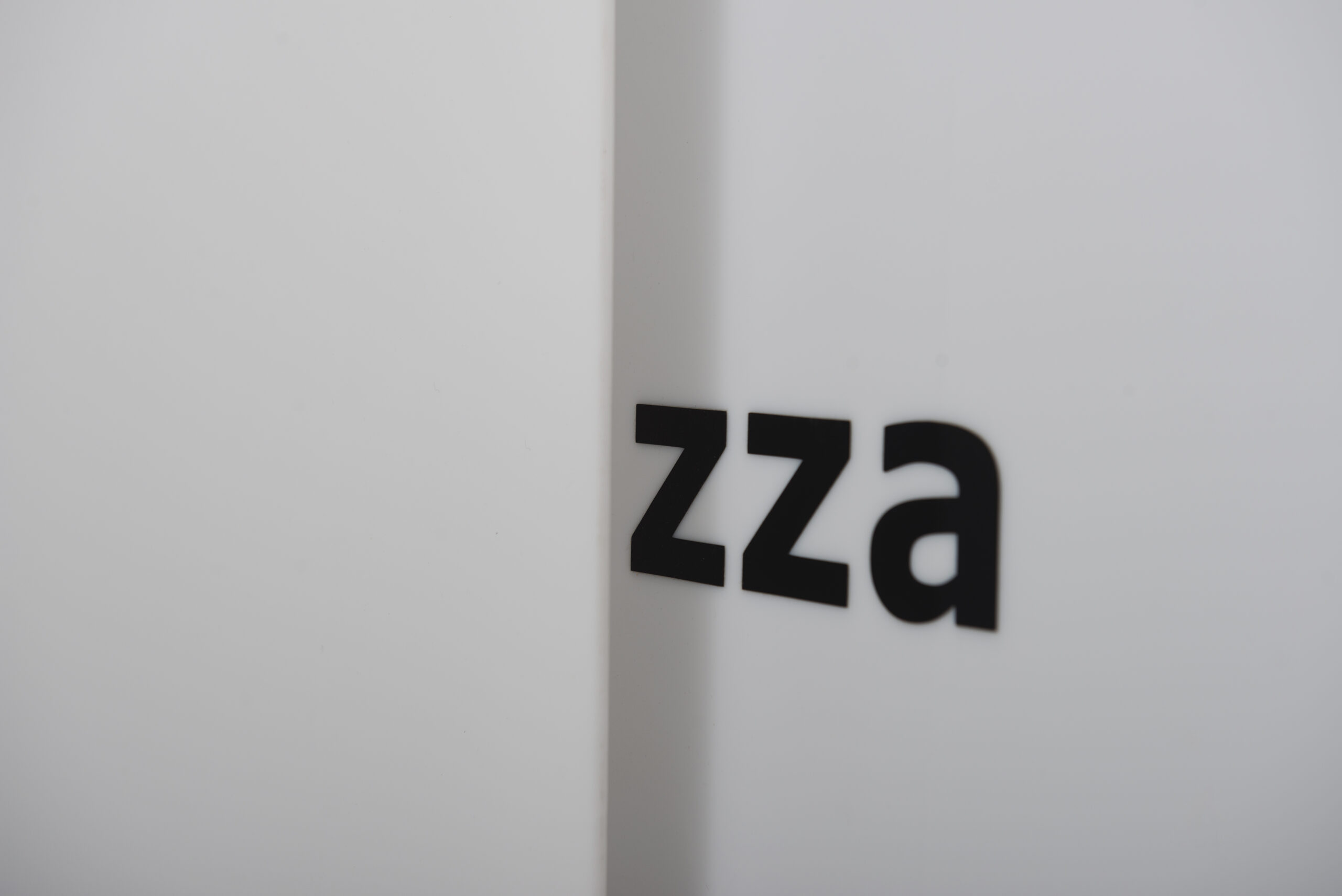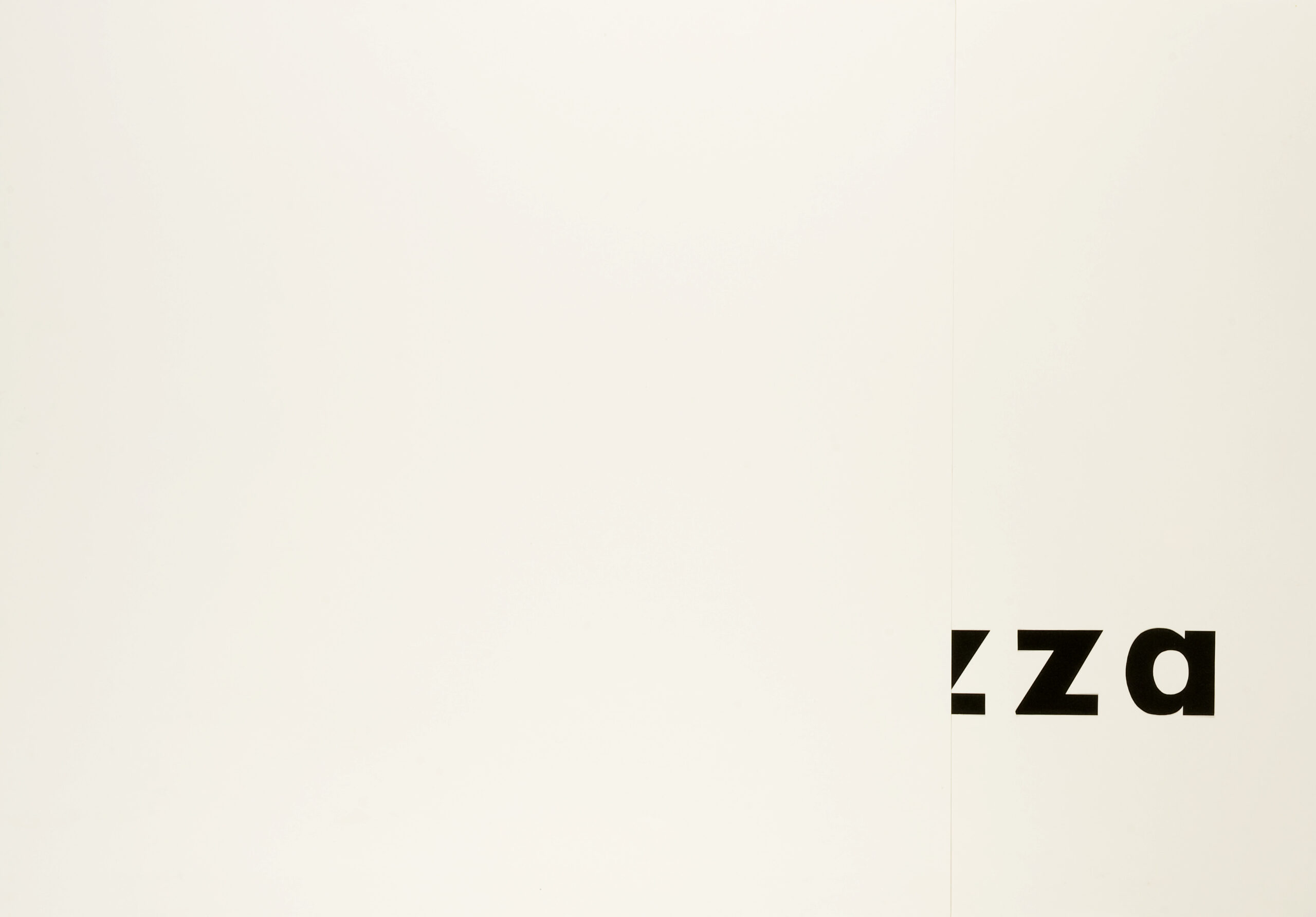 Praca oparta na tautologii; słowo „zza” (czarne litery wycięte z folii), umieszczone na białej planszy, wyłania się zza drugiej białej planszy, nałożonej na pierwszą. Kolejne dzieło z serii prac-obiektów wykorzystujących tautologię, które powstały w tym samym czasie na wspólną wystawę. Są to także: między, wycięte, prz/ez, w. Praca realizowana była na papierze i bezpośrednio na ścianie.