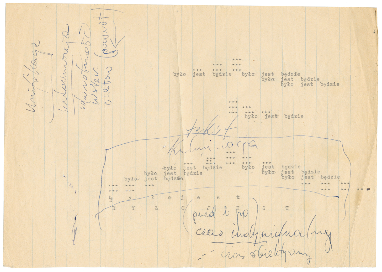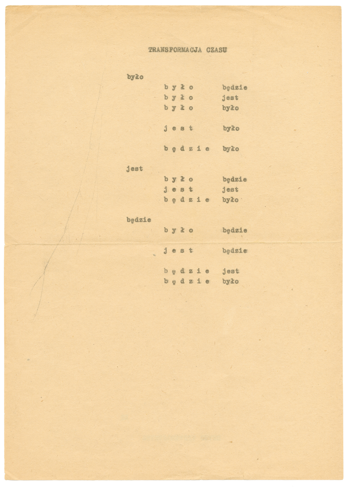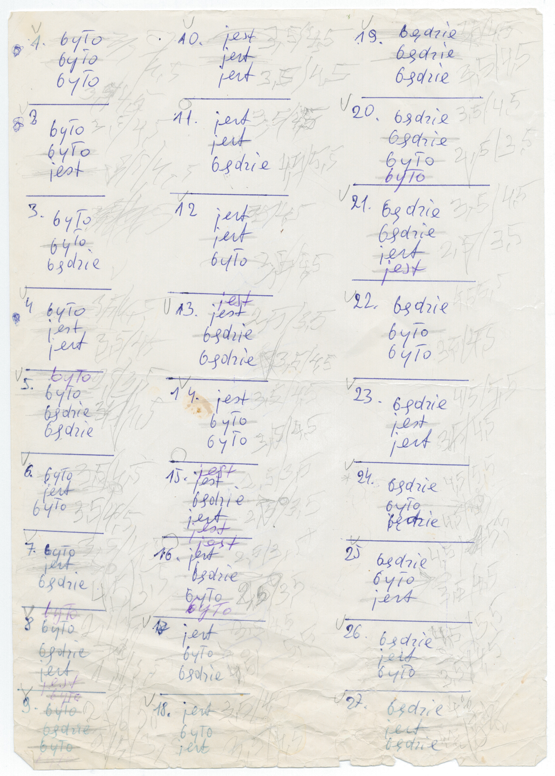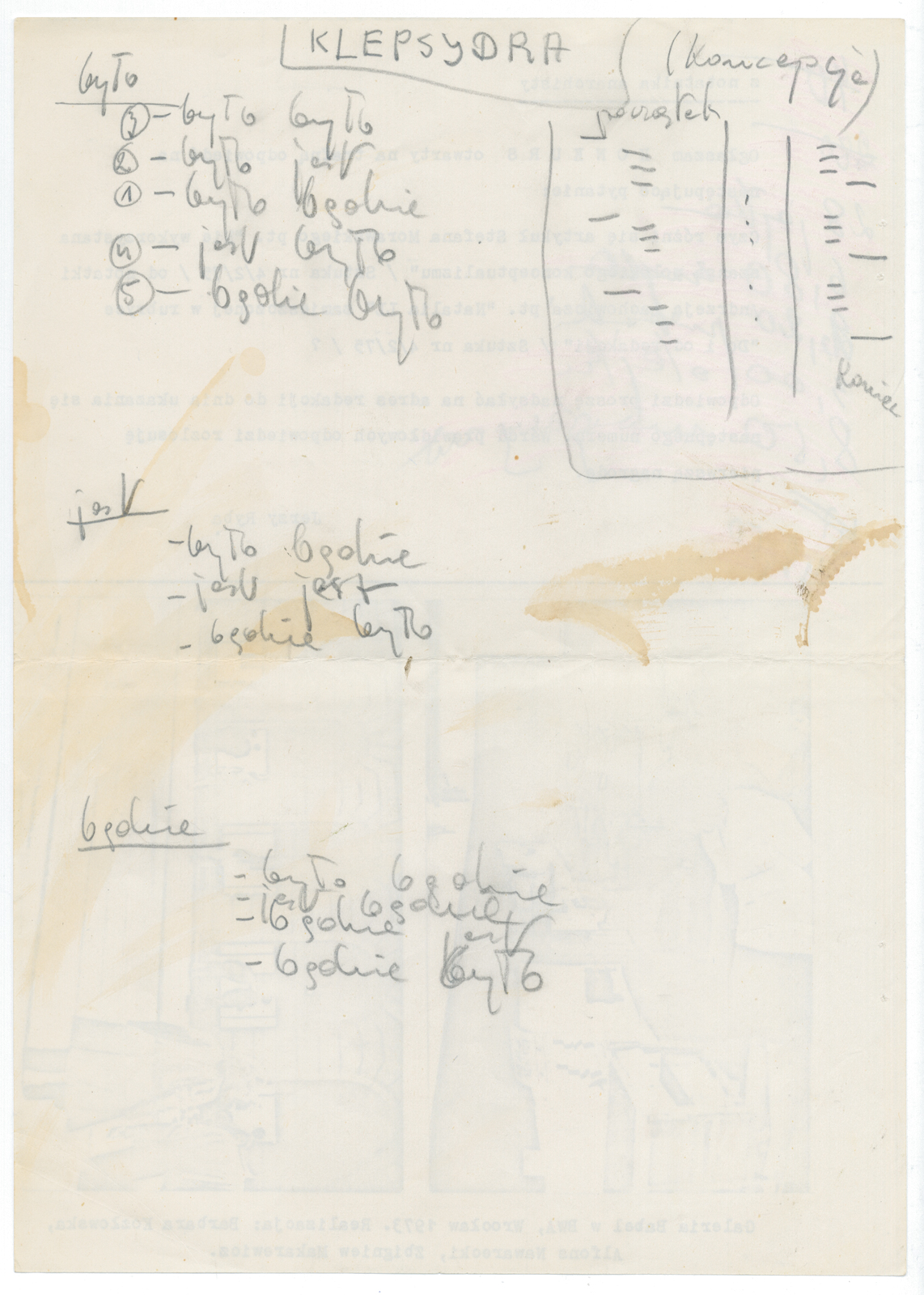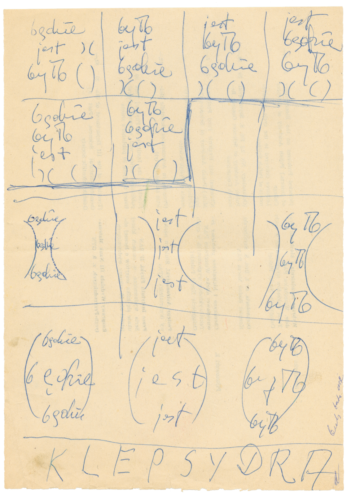 Praca w ostatecznej wersji składa się z 54 plansz (1990); w pierwszej wersji była to jedna plansza. Zwielokrotnione słowa „było” „jest” „będzie” ułożone są w kształt klepsydry (zegara piaskowego lub wodnego), zamieniając się miejscami według założonego przez autora systemu, opartego na zasadzie matematycznej permutacji. Słowa rozmieszczone są pionowo, ze wzrastającą lub malejącą wielkością liter. Klepsydra jest refleksją nad istotą strumienia płynącego czasu oraz jego percepcją przez człowieka. Prezentowana była jako zapisana czarnymi literami na białym tle, w wielu wersjach: maszynopis na kartce papieru, odbitka fotograficzna, plansza wystawowa – ręcznie pisana tuszem na brystolu i emulsją na sklejce, druk na papierze i folii naklejony na sztywne podłoże (PCV, pleksiglas i aluminium – dibond) oraz jako mural na zewnętrznej ścianie budynku (Muzeum Współczesne Wrocław). W 1990 roku opublikowana została broszurka z wszystkimi planszami pełnej wersji Klepsydry (CSW Zamek Ujazdowski, Warszawa), a w 2007 – książeczka w twardej oprawie, również zawierająca całość pracy (Galeria 86, Łódź).