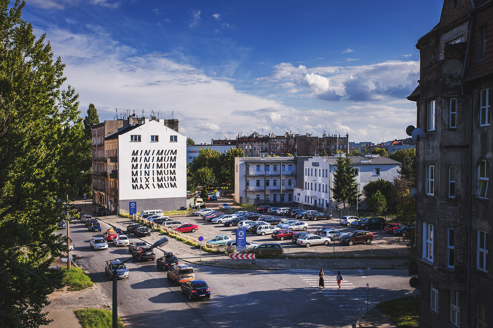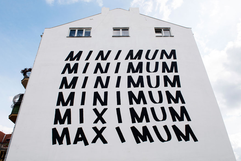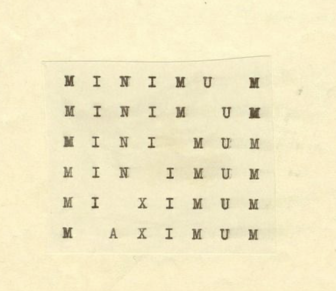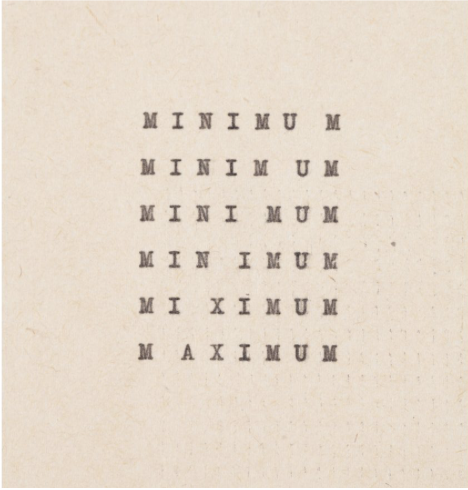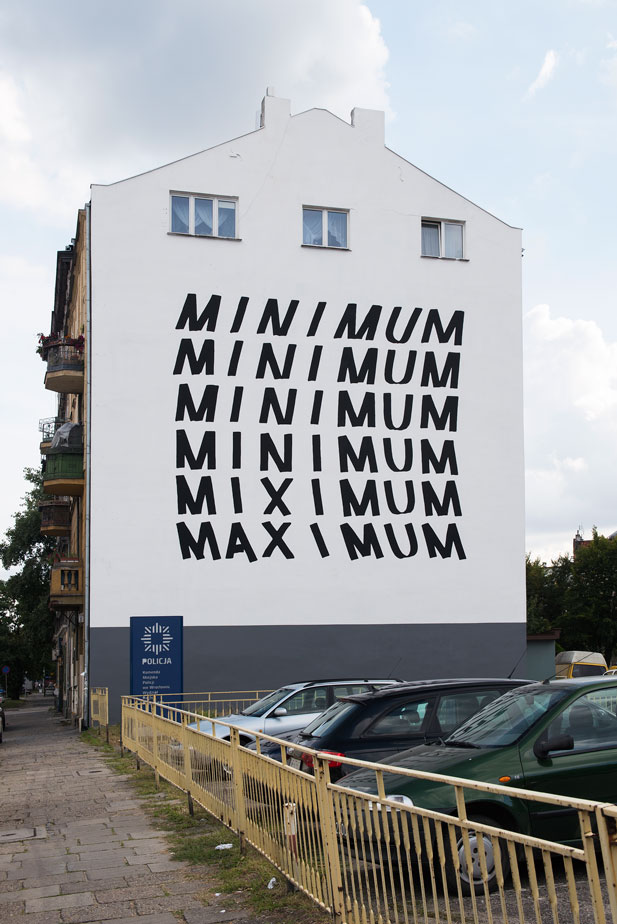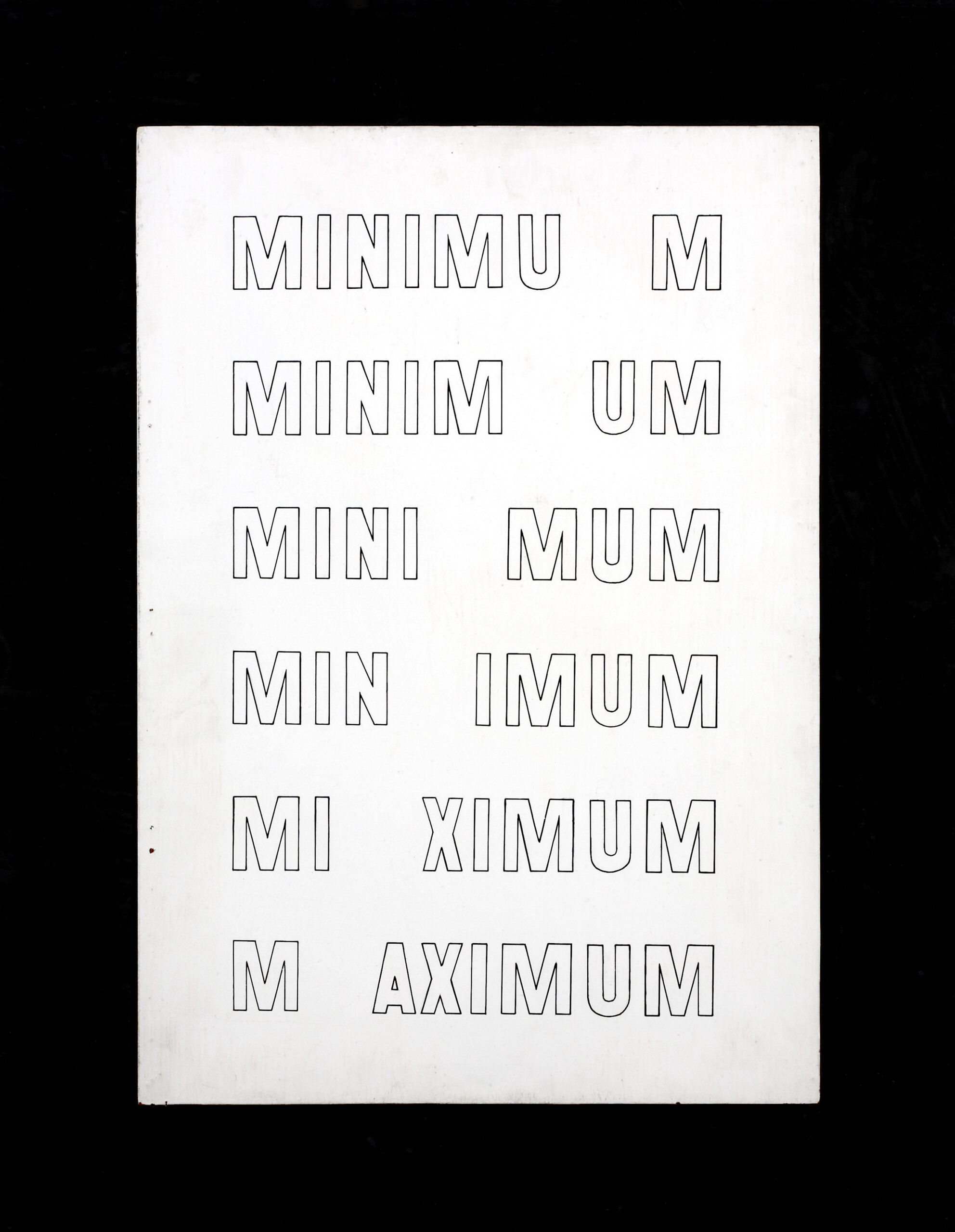 Słowo „MINIMUM”, zapisane wielkimi literami, powielone jest w sześciu wersach i stopniowo przekształca się w słowo „MAXIMUM”. W kolejnych wersach odrywane są kolejne końcowe litery słowa, tworząc po przerwie drugą kolumnę liter. W przedostatnim wersie litera „N” zastąpiona zostaje literą „X”, a w ostatnim – litera „I” – literą „A”. Praca wskazuje na kontrast między znaczeniem pojęcia a słowem je nazywającym (signifie i signifiant w semiologii). Prezentowana była zarówno w formie czarnych liter na białym tle, jak i białych na czarnym tle, w wielu wersjach: maszynopis na papierze, plansza wystawowa – tekst ręcznie pisany tuszem na brystolu i płycie pilśniowej, druk na papierze, folii i na aluminium (dibond) oraz mural na zewnętrznej ścianie budynku (Wrocław, 2016 – zrealizowana została wersja pierwotna pracy, z zakrzywiającymi się literami).