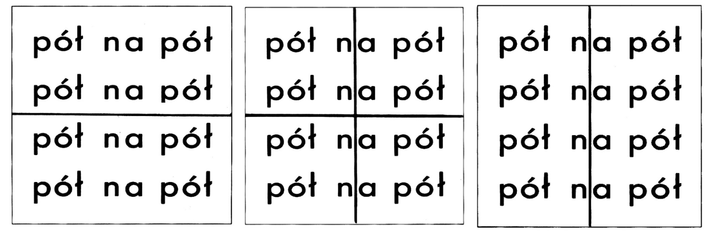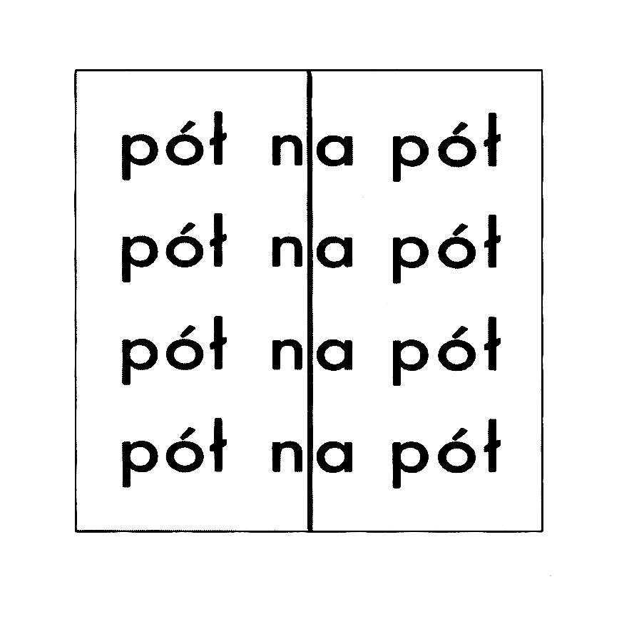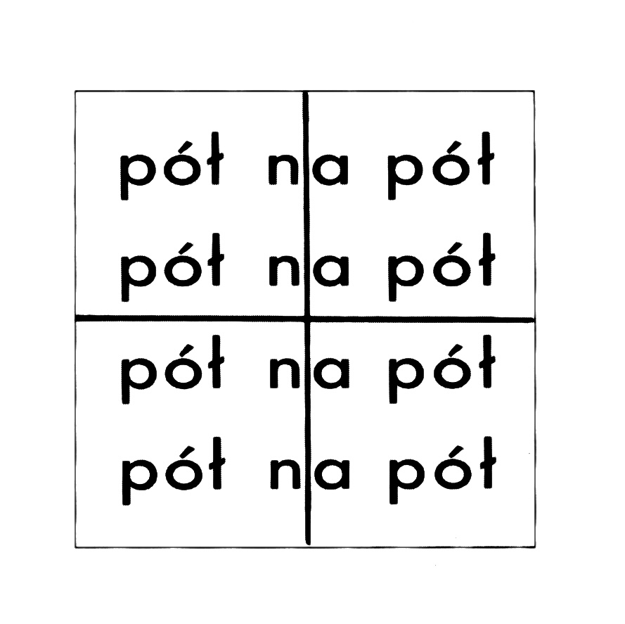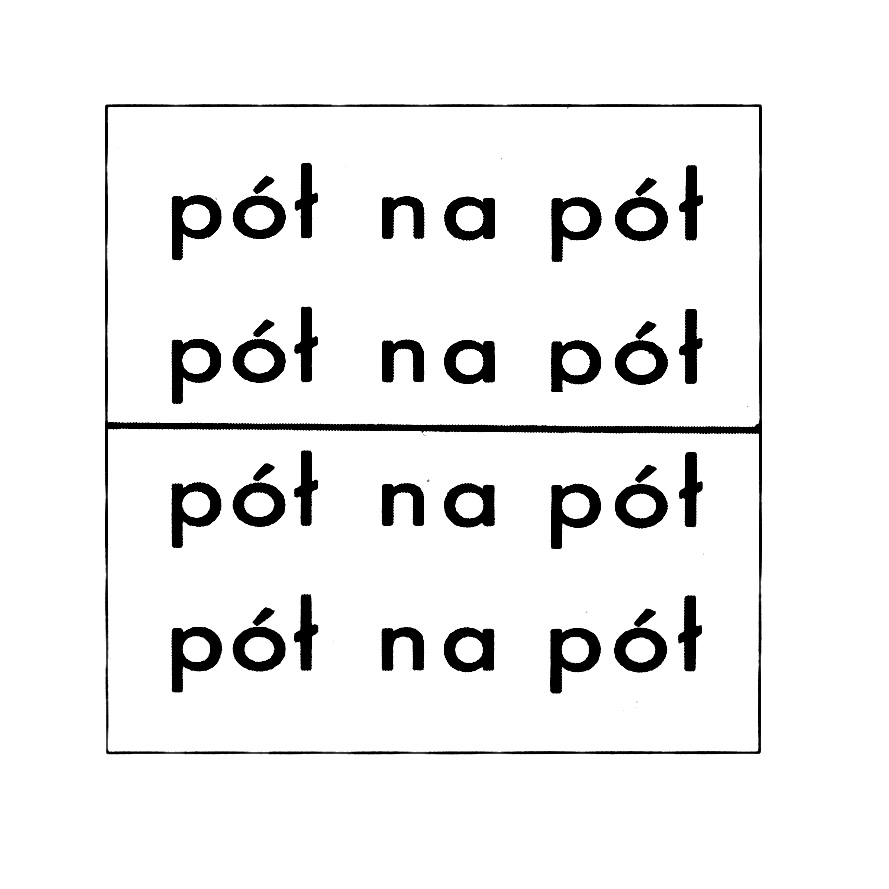 Praca złożona jest z trzech kwadratowych plansz; na każdej z nich czterokrotnie zapisane jest wyrażenie „pół na pół”. Pierwsza plansza przecięta jest symetrycznie poziomą linią, trzecia – pionową, natomiast druga – skrzyżowanymi obiema liniami. W przypadku obu skrajnych plansz ich połowy można nałożyć na siebie jak w lustrzanym odbiciu; niemożliwe jest to w przypadku środkowej planszy, na której powstają ćwiartki dzielące się między literami „n” i „a”. Koncepcja dzieła oparta jest na tautologii, która załamuje się po nałożeniu na siebie dwóch symetrii osiowych wzajemnie prostopadłych. Zachodzi tu jednak jeszcze jedna ciekawa sytuacja, która przywołuje ideę pracy na: po przecięciu tego słowa pionową linią między literami składającymi się na to słowo, litery nakładają się na siebie wzdłuż tej osi, tworząc kolejną tautologię. Praca realizowana była w postaci wydruku cyfrowego na sztywnym podłożu.